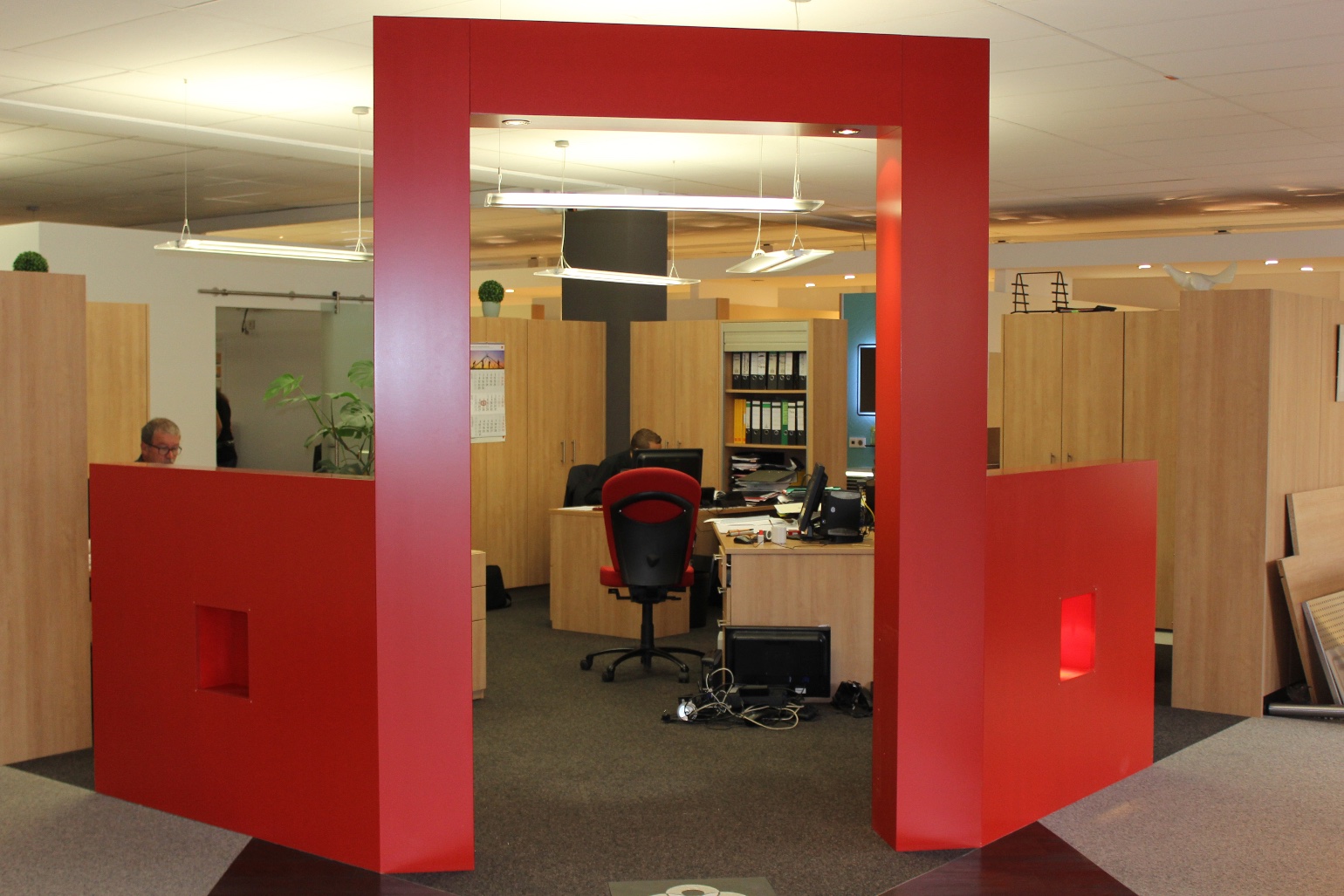 Der Kundenempfang hier demontiert fotografiert ist in der Farbe Rot und passt nicht mehr zum CI der Firma. Da diverse Anschlüsse wie Lampen, Strom, Telefon für 2 Schreibtische montiert sind ist eine Neuanschaffung oder Lackierung wesentlich teurer und umständlicher.